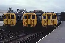 Through electric services commenced on 13 March 1938, when the LMS electrified the lines from Birkenhead Park to West Kirby.[9] The service was provided by the then-new LMS electric multiple units. However, on Sunday mornings, the service was provided by the older Mersey Railway electric units[10] which, up until that point, had only ever run from Liverpool to Birkenhead Park. The 230 ft (70 m)[7] concrete platform awning was erected, at the time of the 1938 electrification, along with a similar structure at New Brighton.[11][12] However, the station building, across the end of the tracks, was left untouched from Victorian times.