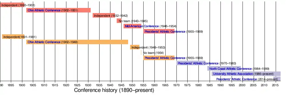 Presidents' Athletic ConferenceUniversity Athletic AssociationNorth Coast Athletic ConferencePresidents' Athletic ConferencePresidents' Athletic ConferenceOhio Athletic ConferencePresidents' Athletic ConferenceMid-American ConferenceOhio Athletic Conference