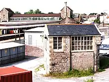 The new station again featured a train shed which covered the platforms.[3] This was designed by the railway's engineer, Francis Fox, and was similar to the one built by him at about the same time at Exeter. The two platforms were supplemented by an excursion platform next to the goods depot.[4] A new Bristol and Exeter Hotel was opened to serve the new station; it was later renamed The Town Crier. A signal box was provided and is now the earliest part of the station to survive. Although disused, it is believed to be the oldest signal box in Britain. It shows signs of a later extension to allow extra signal levers needed when the station was enlarged.[5]
