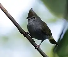 In its coloration, morphology and acrobatic habits, this bird resembles a vireo quite a lot. However, it has a prominent crest like many yuhinas, which together with the unusual biogeography has served to obscure its true relationships for a long time. The crested head, back, wings and tail of this bird are olivaceous or golden brown while the underparts are white.