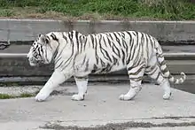 The white tiger or bleached tiger is a leucitic pigmentation variant of the mainland Asian tiger. It is reported in the wild from time to time in the Indian states of Madhya Pradesh, Assam, West Bengal, Bihar, Odisha, in the Sunderbans region and especially in the former State of Rewa.[1] It has the typical black stripes of a tiger, but its coat is otherwise white or near-white.