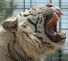 Outside of India, inbred white tigers have been prone to crossed eyes, a condition known as strabismus,[15] due to incorrectly routed visual pathways in the brains of white tigers. When stressed or confused, all white tigers cross their eyes.[16] Strabismus is associated with white tigers of mixed Bengal and Siberian ancestry. The only pure-Bengal white tiger reported to be cross-eyed was Mohini's daughter Rewati. Strabismus is directly linked to the white gene and is not a separate consequence of inbreeding.[17][18][19]