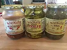 Wickles is an American food manufacturer that sells pickles. The company originated in Dadeville, Alabama.[1] Wickles offers an original spicy pickle along with other signature products such as original relish, green jalapeno relish, red jalapeno relish, pickled okra, garden mix and their new dirty dill pickles line.