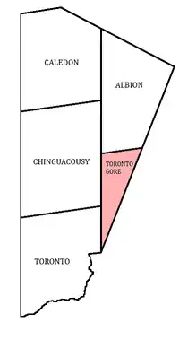Toronto Gore came into existence as a township in 1819[1] when it was separated from Chinguacousy Township. In 1867 it became part of Peel County when that county was split from York County. A small wedge-shaped tract of land, Toronto Gore was located in the east of the county, on the border with York County (and later, Region).[2] It was south of Albion Township, east of Chinguacousy Township (the boundaries being located along Castlemore and Airport Roads respectively in present-day Brampton), and northeast of Toronto Township (now Mississauga). In 1952, the southern portion of the township (south of the present Steeles Avenue) was annexed to Toronto Township,[3] and in 1974 the remainder was amalgamated into the City of Brampton.[4]
