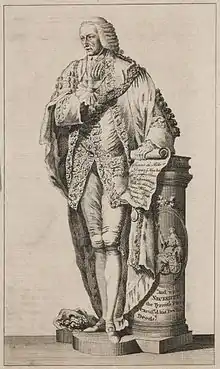 In March 1770 following the release of John Wilkes, of whom Beckford had been an ardent supporter, Beckford decorated his house with a large banner, which according to Horace Walpole bore the word Liberty written in 3-foot-high (0.91 m) embroidered white letters. A few weeks later, on 23 May, Beckford publicly admonished George III. Breaking contemporary protocol he asked the King to dissolve Parliament and to remove his civil councillors, referring to "our happy constitution as it was established in the Glorious and Necessary Revolution".[13] King George was reportedly more enraged by the breach of protocol than by the nature of the request, yet it attracted the support of the Common Councilmen of London who expressed their gratitude by erecting a monument in the Guildhall, London including a life-size statue of Beckford (pictured), surmounting a stone tablet on which the words Beckford had used to admonish the king are engraved in gold.