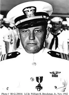 The President of the United States of America takes pleasure in presenting the Navy Cross to Lieutenant Commander William Herman Brockman, Jr. (NSN: 0-61342), United States Navy, for extraordinary heroism and distinguished service in the line of his profession as Commanding Officer of the U.S.S. NAUTILUS (SS-168), in the Battle of Midway. On 4 June 1942, Lieutenant Commander Brockman aggressively developed a contact with major enemy forces and doggedly pushed home a torpedo attack on a screened aircraft carrier against determined and repeated enemy counter measures by gunfire barrage, depth charging and bombing from the air. The attack culminated successfully and Lieutenant Commander Brockman is credited with closing and sinking of a 10,000 ton enemy aircraft carrier. His skill, determination, courage and fortitude were in keeping with the highest traditions of the Naval Service.[1]