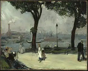 In New York, Glackens became associated with a group of artists known today as The Eight, five of whom (Robert Henri, John Sloan, George Luks, and Everett Shinn as well as Glackens) are considered Ashcan realists. The other members of this loose association were Arthur B. Davies, Ernest Lawson, and Maurice Prendergast. "The Eight" was a not term of the group's own choosing, but after their first exhibition in 1908, it became their unofficial title in the press, alluding to the fact that the artists' cause had little to do with stylistic similarities and everything to do with art politics. These eight men had decided to hold a separate exhibition after experiencing repeated rejection from the "official" exhibitions at the powerful, conservative National Academy of Design. Their breakaway venture was, in part, a way of protesting that controlling body's rigid definition of artistic beauty.[10] Their show at the Macbeth Gallery was a small-scale "succès de scandale" and toured several cities from Newark to Chicago in an traveling exhibition curated by Sloan. The painters gained wider recognition and were invited to exhibit at many institutions. More importantly, they had initiated a national debate about acceptable subject matter in art and the need to end the constraints of The Genteel Tradition in American culture.[11] Most of the Eight also participated in the "Exhibition of Independent Artists" in 1910, a further attempt to break down the exclusivity of the academy.[12]