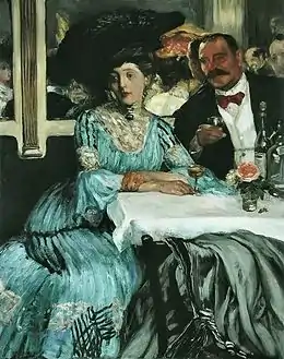Chez Mouquin, in the collection of the Art Institute of Chicago, is arguably Glackens's most celebrated painting. It is set in the well-known Sixth Avenue restaurant regularly visited by Glackens and many of his associates. This lush painting portrays a robust, red-tied James B. Moore, restaurateur and middle-aged bon vivant, at a table with one of the many young women he squired about town. He is drinking, while the lady is turned away, looking somewhat less interested in the convivial scene around them. The backs of their heads are reflected in the mirror behind them, as are the faces and profiles of others, including Edith Glackens and her art critic brother-in-law, Charles Fitzgerald. The painting is often compared to those of Degas, but “the sense of despair in Degas’s [cafe] pictures is replaced in the Glackens by a buoyant 'joie de vivre.'"[27]