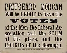He was a Liberal Member of Parliament (MP) for Merthyr Tydfil, from 1888 to 1900, when he was defeated, losing his seat to Keir Hardie.[3] The constituency had two members, the other being the Liberal David Alfred Thomas, 1st Viscount Rhondda: there was antagonism between the two Liberals, however, and in 1900 Thomas backed Hardie.[6] A major political issue between them was attitude to the Second Boer War, supported by Morgan who was on the Liberal imperialist wing of the party. He was in favour of Welsh disestablishment, making a lengthy parliamentary speech on a resolution in 1891.[7]