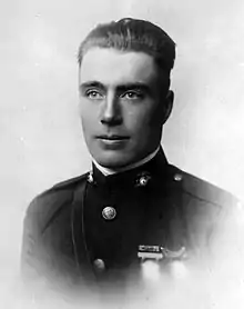 William J. Whaling was born on February 26, 1894, in St. Cloud, Minnesota, as the son of Canadian immigrants. A great athlete, he completed high school and was drafted by St. Louis Browns, an American League baseball team. His career was interrupted by the United States entry into World War I, when he enlisted in the Marine Corps in May 1917. Whaling completed boot camp at Parris Island and then joined the newly organized 1st Battalion, 6th Marines. Following several months of intensive training, he embarked for France, where he spent the next several months with more training and the unloading of the ships.[3][4]