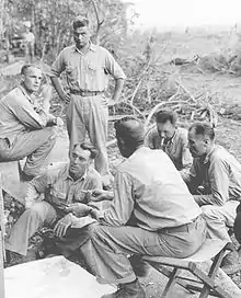 Colonel "Wild Bill" Whaling (sitting on ground) overlooking map of Guadalcanal with accompanying officers