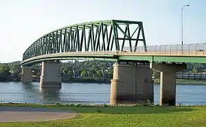 The original bridge at this site was constructed in 1903. It was the first inland cantilever highway bridge in the United States and also site of the first strike, in 1902, by the United Steel Workers union.[1]