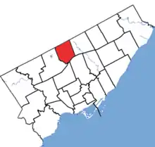 Consisting of that part of the City of Toronto described as follows: commencing at the intersection of the northerly limit of said city with Bayview Avenue; thence southerly along said avenue to Highway No. 401; thence generally southwesterly along said highway to the Don River West Branch; thence generally northwesterly along said branch to Bathurst Street; thence northerly along said street to the northerly limit of said city; thence easterly along said limit to the point of commencement.[4]