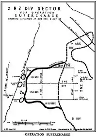 On the night of 1/2 November 1942, the Eighth Army attacked again in the north, with 2nd New Zealand Division in the lead. Freyberg placed 151 Brigade on the right and 152 Brigade on the left. The aim was to attack directly westwards across the Rahman track, with the infantry leading the night assault and 9th Armoured Brigade (now commanded by Brigadier John C. Currie) again passing through to break the enemy gun line and allow X Corps to break out. The assault went to plan except that opposition on the left was heavier than expected which slowed the advance. As a result, the advancing tanks were highlighted against the dawn sky in the east and began to be picked off by Axis anti-tank fire. The Regiment was in the centre of the 9th Armoured Brigade, and the CO lost touch with both his artillery support and close anti-tank support. In the growing light, the B squadron commander (Major M.StJ.V.Gibbs) realised that he was in a ring of enemy anti-tank guns, ahead and to both flanks. He gave the order to 'Charge' and B Squadron overran the anti-tank positions, losing some vehicles but destroying the enemy gun line.[30] Meanwhile, the 21st Panzer Division was counter-attacking A and C Squadrons and at 4 pm the regiment (now down to four tanks) was withdrawn. The 1st Armoured Division from X Corps were just behind the 9th Armoured Brigade but there were no liaison officers between the units and 1st Armoured did not take the opportunity to push on through the broken Axis gun-line.[31]