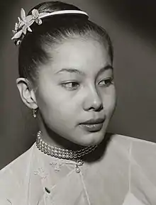 In 1954, a friend of American director Robert Parrish visited her home and took a photograph of her, which he sent to Parrish. She was selected out of some 200 women for the role of Anna in the film The Purple Plain. She had never acted in a film before and reportedly suffered from severe facial convulsions on set and bulging eyes before kissing scenes.[2][3] Variety praised her romantic scenes with Peck, writing: "Subsequently there are some very tender scenes played in a neighbouring village community in which Peck begins a new romantic entanglement with Win Min Than, an exotic yet restrained Burmese beauty."[4][5][6]