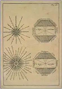 Before the development of the compass rose, a wind rose was included on maps in order to let the reader know which directions the 8 major winds (and sometimes 8 half-winds and 16 quarter-winds) blew within the plan view. No differentiation was made between cardinal directions and the winds which blew from those directions. North was depicted with a fleur de lis, while east was shown as a Christian cross to indicate the direction of Jerusalem from Europe.[2][3]