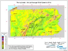 In the U.S. state of Pennsylvania, wind power is one of the primary sources of renewable energy, and accounts for over one third of the state's renewable energy production.[1] There are more than 27 wind farms currently operating in the Commonwealth of Pennsylvania. Theoretically, the energetic development of these wind farms could provide power for nearly 350,000 homes, or 1,300 megawatts.[2] A majority of the farms are located in the southwest-central and northeastern regions of the state.[3] Pennsylvania is an East Coast leader in wind energy due to its natural wind resources and governmental incentives brought on by the state. There is a lot of potential for growth within the wind power industry in Pennsylvania and the Northeast. Despite being one of the few landlocked states in the Mid-Atlantic region, Pennsylvania is close to several offshore sites along the coast of the Atlantic Ocean.