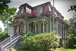 The Wing House is a three-story Second Empire structure with a brick lower story, set below grade, and a slightly convex mansard roof sheathed with tin. The top of the roof is ornamented by a cornice with modillions. A divided porch, reached with a stone stairway, runs along the front facade. The main entrance is in a projecting central bay, through arched double doors. A side porch runs along en side of the house. The windows are tall, arched, double hung one-over-ones.[3]