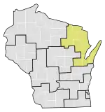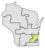 From 1965 to 2003, the district included most of the western and north-western suburbs of Milwaukee. In its final configuration, it contained all of Washington and Ozaukee counties, most of Dodge and Jefferson counties, the northern and western halves of Waukesha county and the eastern parts of Sheboygan county, including the town itself.[1] It was usually the most Republican district in the state, voting 63% to 34% for George Bush over Al Gore at the 2000 election.[2] The district was also the longest in the state (as well as the last) to be represented by a member of the Wisconsin Progressive Party however, when the party briefly surged to dominate Wisconsin’s politics during the 1930s, being represented by Merlin Hull for twelve years until 1947, when he switched to the Republican Party. At the time, the district covered much of the far western part of the state.