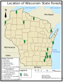 A Wisconsin state forest is an area of forest in the U.S. state of Wisconsin managed by the Wisconsin Department of Natural Resources's Division of Forestry. They are managed for outdoor recreation, watershed and habitat preservation, and sustainable forestry. The various units total 471,329 acres (1,907 km2), although many contain extensive private inholdings. Wisconsin's state forests are often co-listed with Wisconsin's state park system, which is maintained by the Division of Parks and Recreation.