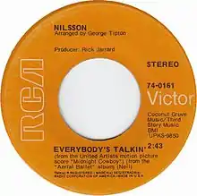 Pandemonium Shadow Show was followed in 1968 by Aerial Ballet, an album that included Nilsson's rendition of Fred Neil's song "Everybody's Talkin'". A minor US hit at the time of release (and a top 40 hit in Canada), the song would become more popular a year later when it was featured in the film Midnight Cowboy, and it would earn Nilsson his first Grammy Award.[15] The song would also become Nilsson's first US top 10 hit, reaching No. 6, and his first Canadian #1.[17]