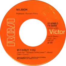 Later that year, Nilsson went to England with producer Richard Perry to record what became the most successful album of his career, Nilsson Schmilsson, which yielded three stylistically different hit singles. The first was a cover of Badfinger's song "Without You" (by Welsh and British songwriters Pete Ham and Tom Evans respectively), featuring a highly emotional arrangement and soaring vocals to match – recorded, according to Perry, in a single take. It was alleged, by Harry himself, that, upon hitting the highest note of the song, he burst a large haemorrhoid.[11] The performance earned him his second Grammy Award.[15]