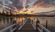 Wollongong (/ˈwʊlənɡɒŋ/ WUUL-ən-gong; Dharawal: Woolyungah), colloquially referred to as The Gong, is a city located in the Illawarra region of New South Wales, Australia. The name is believed to originate from the Dharawal language, meaning either 'five islands/clouds', 'ground near water' or 'sound of the sea'.[3] Wollongong lies on the narrow coastal strip between the Illawarra Escarpment and the Pacific Ocean, 85 kilometres (53 miles) south of central Sydney.[4] Wollongong had an estimated urban population of 302,739 at June 2018, making it the third-largest city in New South Wales after Sydney and Newcastle and the tenth-largest city in Australia by population.[5] The city's current Lord Mayor is Gordon Bradbery AM who was elected in 2021.[6]