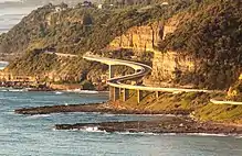In the north the escarpment meets the coastline, and north of this the coastal road Lawrence Hargrave Drive hugs the cliff line. The unstable geology of the escarpment resulted in rockfalls, forcing the closure of the road. Subsequently, part of Lawrence Hargrave Drive was replaced in 2005 by the Sea Cliff Bridge just off the coast, crossing the submerged rock shelf. The bridge carries both vehicular and pedestrian traffic. The Illawarra railway line must go through several tunnels to reach the Sydney metropolitan area. The Southern Freeway and Princes Highway provide alternative inland routes, descending the escarpment further south at Bulli Pass or at Mount Ousley, entering just north of Wollongong's city centre.