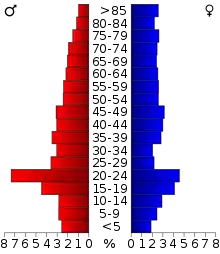 In the county, the population was spread out, with 18.8% under the age of 18, 18.6% from 18 to 24, 22.3% from 25 to 44, 23.1% from 45 to 64, and 17.2% who were 65 years of age or older. The median age was 34.7 years. For every 100 females there were 114.8 males. For every 100 females age 18 and over, there were 109.9 males.