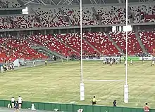 The first tournament was played in Singapore as the opening event of the new National Stadium in June 2014.[5] The Auckland Blues of New Zealand won the final by 10–5 after double extra time against Australia's ACT Brumbies.[6] However, the event was overshadowed by a serious injury during the third-place playoff match that ended the rugby career of Welsh player Owen Williams.[7]