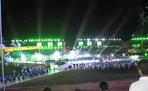 The group Nota sang the Puerto Rico regional anthem in the opening ceremony.[22] After the parade of all delegations, Olga Tañón opened the show with a performance that featured over 30 dancers and a fireworks display. When raising the flag of the city of Mayaguez, the "Mayagüezanos", Chucho Avellanet and Hilda Ramos (soprano-opera singer) sang the anthem of Mayagüez. Jose Guillermo Rodriguez mayor of Mayagüez spoke, followed by Felipe Perez president of the organizing committee, then by Hector Cardona president of ODECABE. Immediately after Hector Cardona finished talking, Luis Fortuño, Governor of Puerto Rico declared the games officially opened. Gilberto Santa Rosa performed, followed by Nestor Torres, then Bernie Williams, and afterward Wisin & Yandel also gave a performance.[23] It was the first time in the history of the Central American and Caribbean Games that athletes parades in an opening ceremony with medals already won.[24]