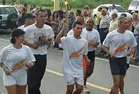 The flame arrived in Puerto Rico and the torch relay went across all 78 municipalities for 22 days and ended its route on 18 July when the games were inaugurated and the fire was placed at the Central American and Caribbean Games cauldron.[14] The governor of Puerto Rico, Luis Fortuño, received the torch at Rafael Hernández Airport in Aguadilla. The first runner in the relay was Puerto Rican golfer Miguel Suárez.[15] The relay began 27 June and went through Aguada, Rincón, Añasco and Las Marías that day. The next day the relay continued through San Sebastián, Moca, Isabela y Quebradillas.[15] By 6 July the torch reached San Juan, where it was received by Richard Carrion, member of the International Olympic Committee in the Milla de Oro.[16] Accompanying the torch and the different runners was a caravan of different official cars, trucks and buses that followed the torch across the island. On 18 July the flame arrived at the Central American and Caribbean Games in time for the opening ceremony.