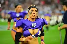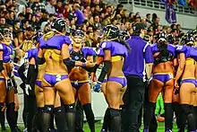 LFL players with experience in track and field competitions noted that the typical LFL uniform is comparable to other uniforms, with Elizabeth Govrick of the Minnesota Valkyrie stating she "ran track and I was wearing, you know, stuff if not close to almost smaller than what I'm wearing out on the football field. You take beach volleyball, you take volleyball, you take other sports where it's pretty much the same thing."[41] Adrian Purnell of the Jacksonville Breeze said that the outfits were only for marketing purposes.[42] Heather Furr, a quarterback for the Chicago Bliss said "I think with little girls watching the game ... if they can see past the uniform and see us as role models, then that's what I want."[40] Abbie Sullivan of the Cleveland Crush stated, "Just because we play in the LFL does not mean we promote promiscuity. We are smart females. We are athletes who take care of our bodies. We are the total package." Similarly, Toledo Crush player Marija Condric stated, "Everyone is entitled to their own opinion. Sit down and watch. You'll forget what we are wearing and you will be thinking about how hard that girl got hit on that last play."[43]