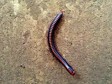 Xenobolus carnifex is a species of spirobolidan millipede found in South India and Sri Lanka.[1] It is a common species and can become a household pest, infesting and damaging thatched roofs, creating a "continual shower of faecal pellets", and invading food and water supplies.[2] X. carnifex ranges from 58 to 65 mm (2.3 to 2.6 in) in length, with 48 to 50 body segments.[3] The body color is dark or black, with a band of red or pink running down the dorsal midline.[1]