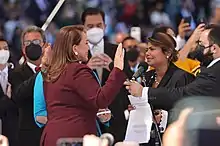 Castro was inaugurated as president on 27 January 2022.[37] She was sworn in at the Tegucigalpa National Soccer Stadium,[38] with thousands of individuals present. Among the attendees were King of Spain Felipe VI, Vice President of Taiwan Lai Ching-te, U.S. Vice President Kamala Harris, Vice President of Argentina Cristina Fernández de Kirchner, Vice President of Cuba Salvador Valdés Mesa and President of Costa Rica Carlos Alvarado Quesada.[39]
