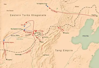 After Emperor Taizong took the throne, he made Li Shiji the commandant at Bing Prefecture (并州, roughly modern Taiyuan, Shanxi). In 629, when Emperor Taizong launched a major attack against Eastern Tujue's Jiali Khan Ashina Duobi (a.k.a. Jieli Khan or Illig Qaghan), commanded by Li Jing, Li Shiji was one of the major generals under Li Jing's command and was in charge of one of the four prongs of attack. In spring 630, after Li Shiji defeated Eastern Tujue forces at Baidao (白道, in modern Hohhot, Inner Mongolia) and after Li Jing defeated Ashina Duobi's main forces and forced Ashina Duobi to flee, he met with Li Jing and decided to, despite the fact that Ashina Duobi claimed to then seek peace, attack Ashina Duobi, defeating him again and capturing most of Ashina Duobi's remaining forces. (Ashina Duobi himself fled further and was later captured by forces under the command of Emperor Taizong's cousin Li Daozong the Prince of Rencheng County.)