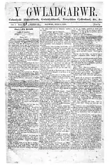 Y Gwladgarwr ("The Patriot") was a liberal Welsh language newspaper, established in 1858, published weekly in Aberdare by Abraham Mason, and distributed around the districts of South Wales. Devoted to Welsh literature, the paper provided poets and authors of the valleys and South Wales more generally with a means of publishing their works. Amongst the newspaper's poetry editors were William Williams (bardic name Caledfryn, 1801–1869) and William Thomas (bardic name Islwyn, 1832–1878).[1]