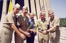 A VIP Kennedy Memorial tree planting center is included on the grounds of the memorial, where many distinguished visitors from other countries have planted trees.[26] In May 1978 Jacqueline Kennedy, widow of the president, visited the memorial and planted a tree in the forest.[27][28] Other members of the Kennedy family who have visited the memorial and planted trees include U.S. Senator Ted Kennedy (JFK's brother), on 11 December 1986;[29] Joan Kennedy (Teddy Kennedy's first wife), on 24 January 1983;[30] and Robert F. Kennedy, Jr. and his sister Kathleen Kennedy Townsend (JFK's nephew and niece; children of Robert F. Kennedy), on 1 January 1987.[31] A special "Kennedy Family Planting Circle" was established by the Jewish National Fund.[32][33] In 2001 Kennedy's daughter Kathleen Kennedy Townsend, then Lieutenant Governor of Maryland, visited Yad Kennedy during her tour of Israel with her husband and three of her four daughters.[34]
