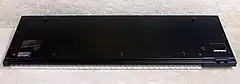 The V50 keyboard consists of 61 keys, covering 5 octaves. It supports both velocity sensitivity and channel aftertouch. The MIDI transmit channel of the keyboard is configurable. Wheels for pitch bend and modulation control are provided on the left side of the keys.