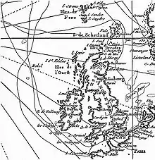 In 1767 he sailed near Rockall, or Rokol. Although he may not have approached within sight of it, or even within 150 miles, he appears to have had good information regarding it. His charted position for it was only 16 miles north of its actual position and he accurately described its appearance[1] and the nearby Helen's Reef: "East of Rokol, ¼ league away, there is a submerged rock over which the water breaks".[2] In 1771, he published a map of the area.