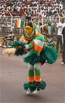 Zaouli is a traditional dance of the Guro people (who speak the Guro language) of central Ivory Coast. The Zaouli mask, used in the dance, was created in the 1950s, reportedly inspired by a girl named "Djela Lou Zaouli" (meaning "Zaouli, daughter of Djela").[1] However, stories on the origins of the characteristic mask are varied, and each mask may have its own symbolic history.[2] It was inscribed in 2017 on the Representative List of the Intangible Cultural Heritage of Humanity by UNESCO.[3]