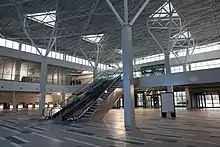 On 14 December 2018, the airport was authorized to take a loan from state-owned banks amounting to ₴280 million. This money should be directed to construction work at the new airport terminal. An enterprise must return the sum at the expense of its own profit.[25] The state of construction of the new terminal of the airport as of February 2019. At the end of 2018, a completely built terminal framework and work on the roof covering was completed. The work on the installation of glass panels are coming to the end. The laying of communications to the terminal building continues. The installation of escalators has begun.[26] According to official data, on 17 December 2018, 50% of all construction works were completed. The terminal rated capacity will be 1 million passengers per year.[27]