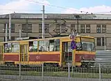 During the year following the liberation of the city from the German troops, work continued on the restoration of the tram system.[10] In the months following the war, 35 km of track and contact network were rebuilt, a traction substation was put into operation, and 10 wagons were repaired. 10 wagons each were received from Kyiv and Kharkiv. In October 1944, the launch of the first line took place with trams operating on two routes.[11]