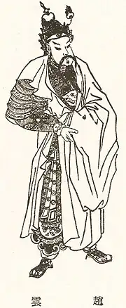 Zhao Yun (Chinese: 趙雲 pronunciation) (died 229),[1] courtesy name Zilong (子龍), was a military general who lived during the late Eastern Han dynasty and early Three Kingdoms period of China. Originally a subordinate of the northern warlord Gongsun Zan, Zhao Yun later came to serve another warlord, Liu Bei, and had since accompanied him on most of his military exploits, from the Battle of Changban (208) to the Hanzhong Campaign (217–219). He continued serving in the state of Shu Han – founded by Liu Bei in 221 – in the Three Kingdoms period and participated in the first of the Northern Expeditions until his death in 229. While many facts about Zhao Yun's life remain unclear due to limited information in historical sources, some aspects and activities in his life have been dramatised or exaggerated in folklore and fiction. In the 14th-century historical novel Romance of the Three Kingdoms, he was lauded as a member of the Five Tiger Generals under Liu Bei.