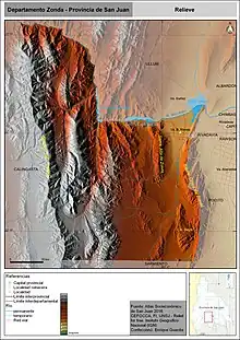 Zonda is located in south central San Juan Province, 20 kilometers (12 mi) from the city of San Juan. it has an area of 2,905 square miles (7,520 km2). It is bordered by the departments of Ullum, Sarmiento, Rivadavia, Pocito, and Calingasta. The department has a mountainous landscape, and is dominated by foothills, or precordillera, of the Andes. Its western border is defined by the Sierra de Marquesado and Sierra Chica de Zonda, mountain range, separate Zonda from its neighboring departments of Rivadavia and Pocitot. The Sierra del Tontal constitutes the department's western border with Calingasta. Within the Sierra del Tontal the Chacay and las Cuevas rivers flow into the Sasso River (Spanish: Río Sasso), a tributary of the San Juan River. Its border to the north with Ullum Department is divided by the San Juan River, along which sit the Punta Negra and Los Caracoles dams. The highest mountain peak within Zonda is the Blanco de las Cuevas, reaching 4190 meters in height.