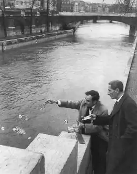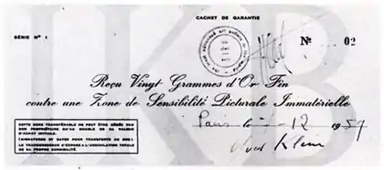 Zone de Sensibilité Picturale Immatérielle (Zone of immaterial pictorial sensibility) is an artist's book and performance by the French artist Yves Klein. The work involved the sale of documentation of ownership of empty space (the Immaterial Zone), taking the form of a receipt, in exchange for gold; if the buyer wished, the piece could then be completed in an elaborate ritual in which the buyer would burn the receipt, and Klein would throw half of the gold into the Seine.[1] The ritual would be performed in the presence of an art critic or distinguished dealer, an art museum director and at least two witnesses.[1]