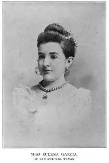 Garcia was known as a pianist, a violinist and a composer.[6] Her compositions included "Our Wedding March" (performed at her own wedding); "The Columbian March (Columbus Landing in America)," which was performed by John Philip Sousa's band at the World's Columbian Exposition in Chicago; "On the Death of Prince Napoleon", "The Spring Palace Waltz", and "The Mockingbird".[4] She represented "Spanish Texans" on the State Board of Lady Managers for the Texas World's Fair Exhibit Association, the organization tasked with creating a state display at the World's Columbian Exposition in 1893.[3] She was the youngest Lady Manager appointed from any state.[6] She performed at a dinner with the Mexican National Band in Chicago in 1892, with many dignitaries of the Exposition present.[7] English writer and Texas newspaperman Henry Ryder-Taylor dedicated a song, "The Snake Ring Song", to Zulema Garcia in 1895.[8][9]
